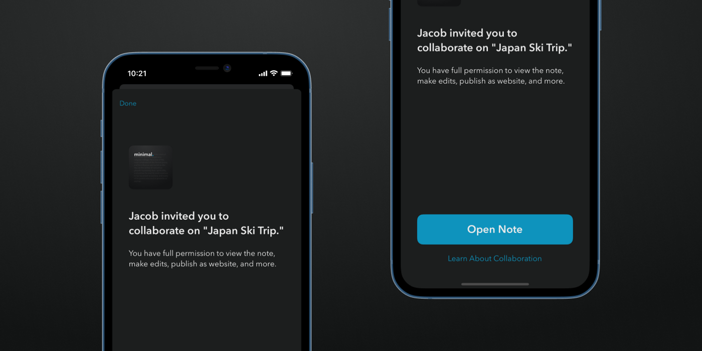 I added a note title, a descriptive sharing image, and a fallback url for new writers who have not yet installed Minimal. I also crafted this contextual invite success message as writers join new collaborations.